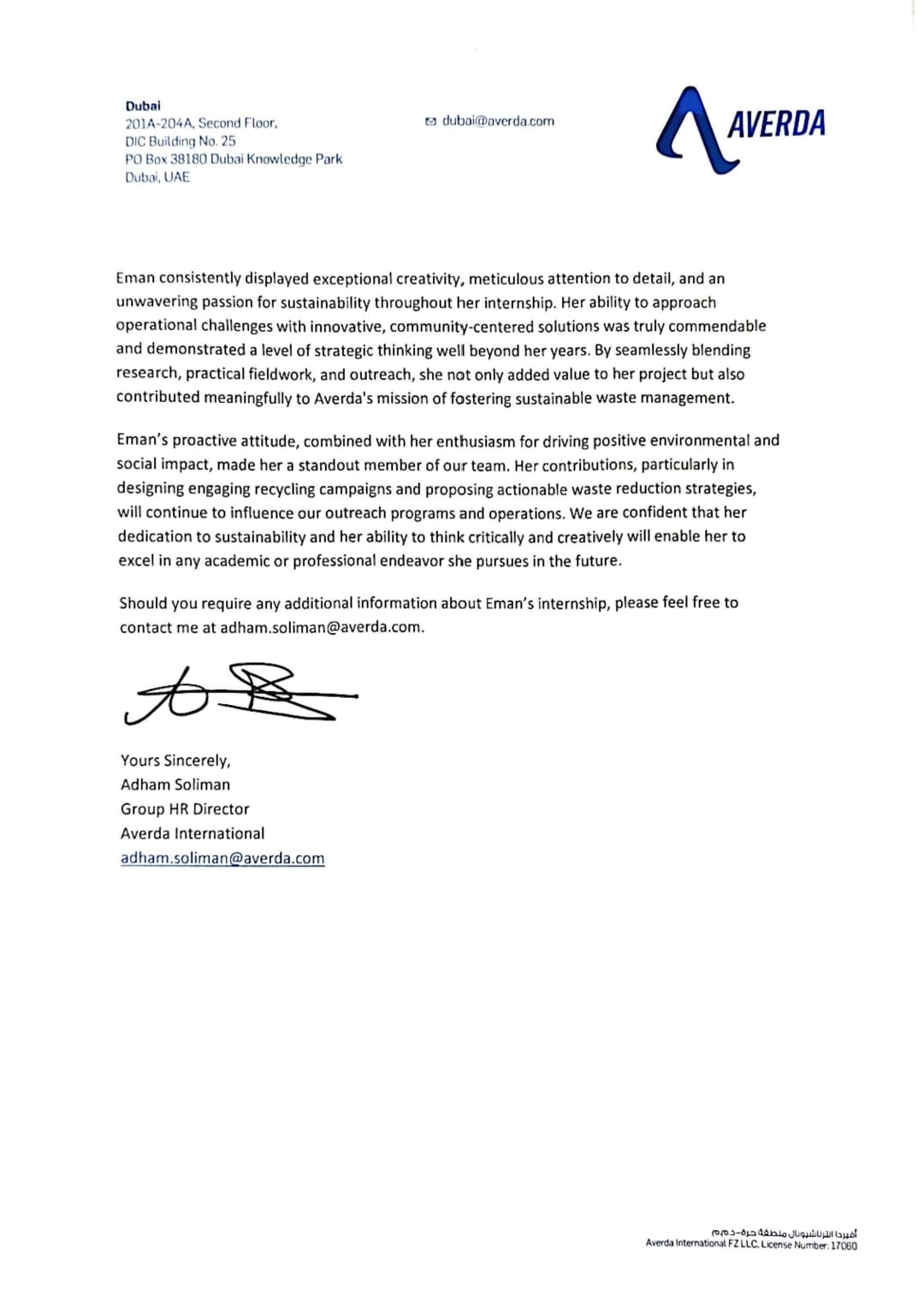 My internship at Averda was an enriching and eye-opening experience that allowed me to bridge academic knowledge with real-world impact. Working on the project in South Africa gave me the opportunity to deeply understand the value of informal waste pickers and their critical role in the recycling ecosystem. The exposure I gained through both research and field visits to Averda’s facilities in the UAE helped me appreciate the operational scale of waste management while also inspiring me to design inclusive frameworks that empower marginalized workers. Overall, the experience strengthened my passion for sustainable development and showed me how innovative solutions can create both environmental and social change..